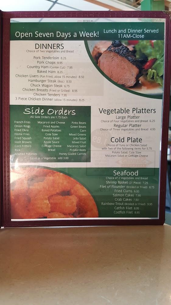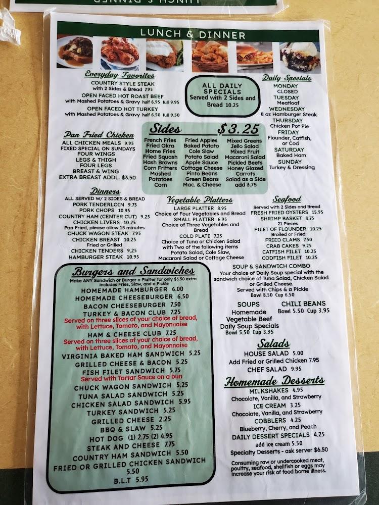 The lunch and dinner selections boast favorites like fried chicken and country ham, alongside generous sides like fried okra and home fries. Burgers and sandwiches cater to those craving quick bites. Seafood lovers delight in the fresh offerings like fried oysters and crab cakes.
